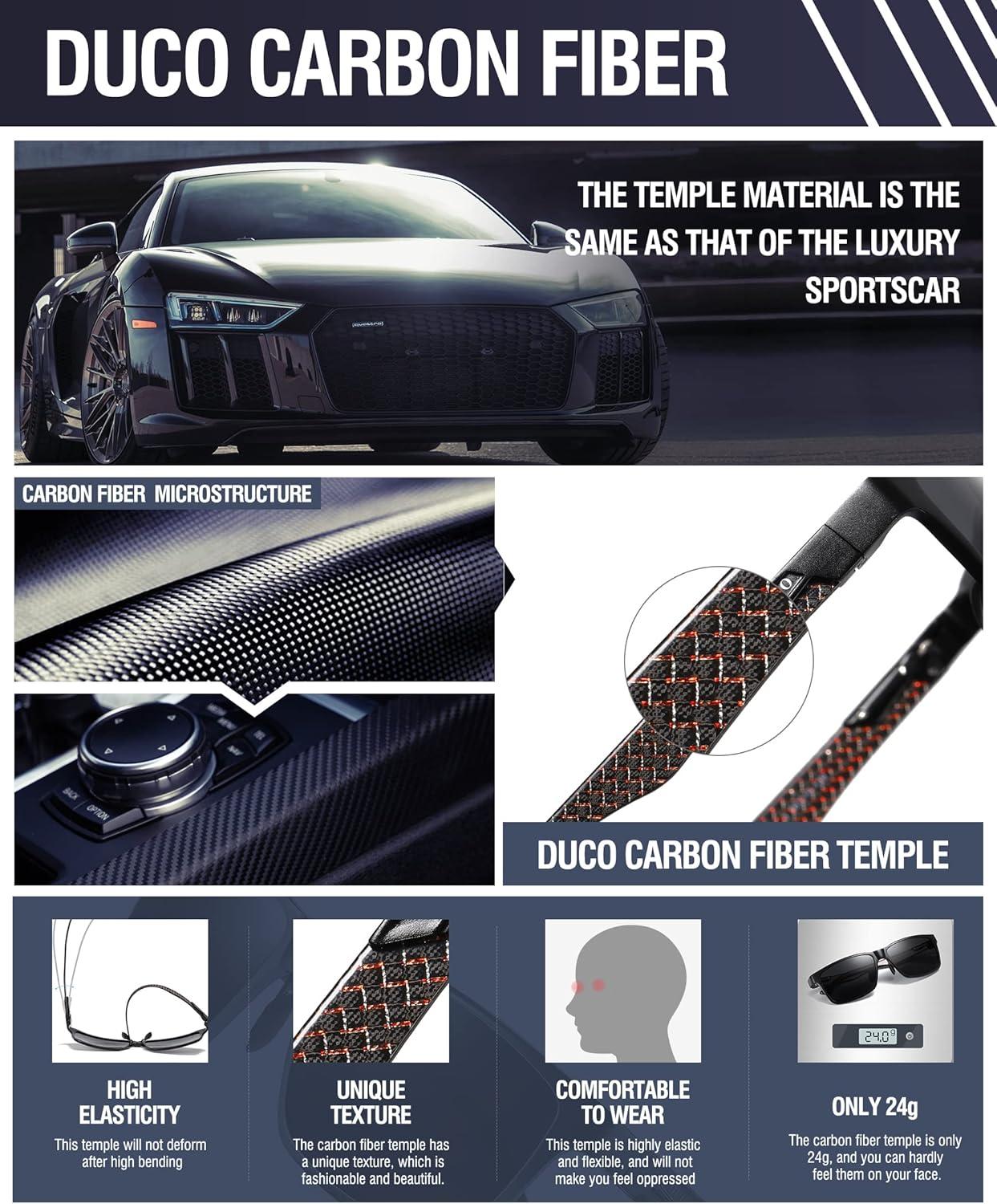 imageDUCO Mens Sunglasses Polarized Rectangle Sunglass for Men Lightweight Carbon Fiber UV400 Protection 8206Black Frame Black Temple Revo Blue Lens