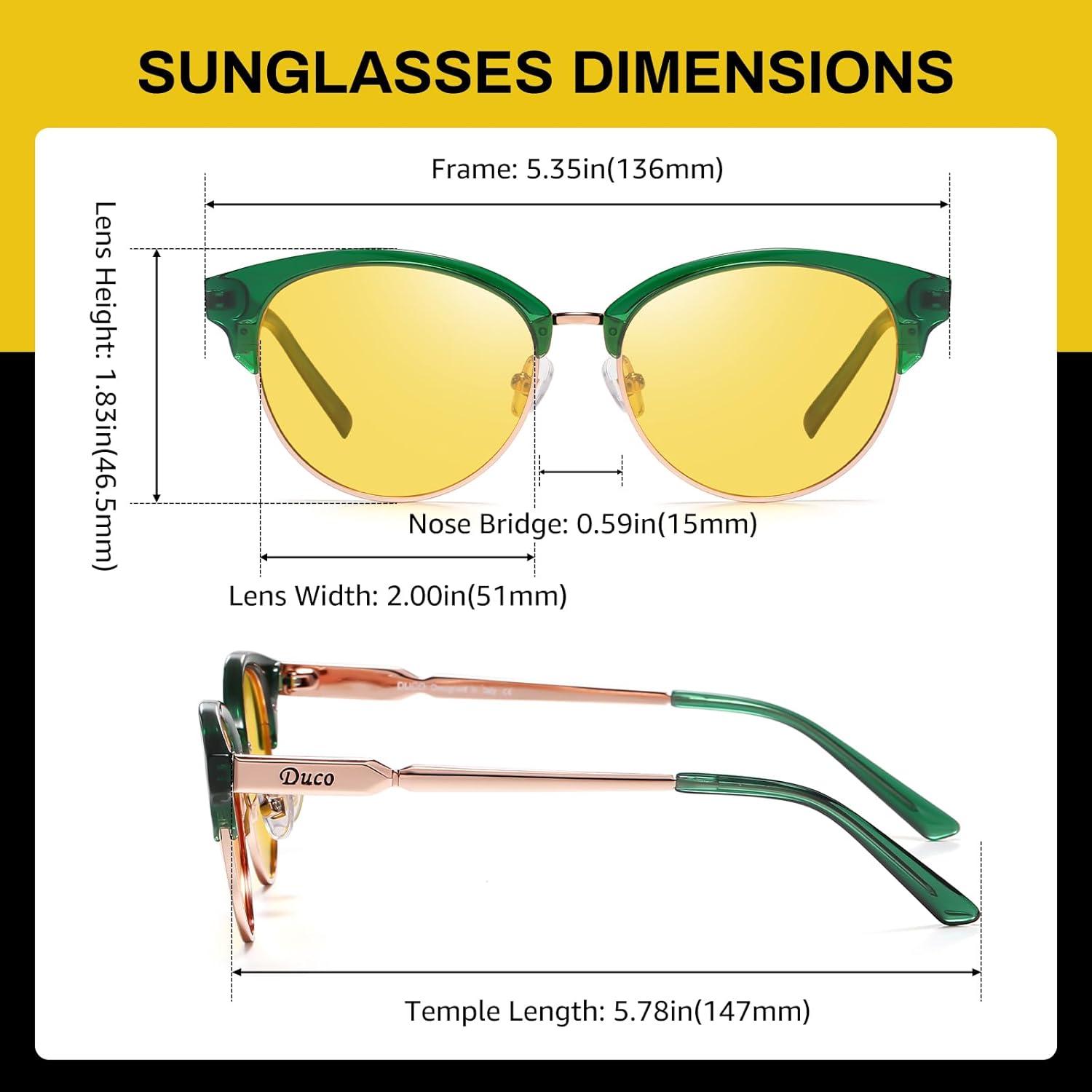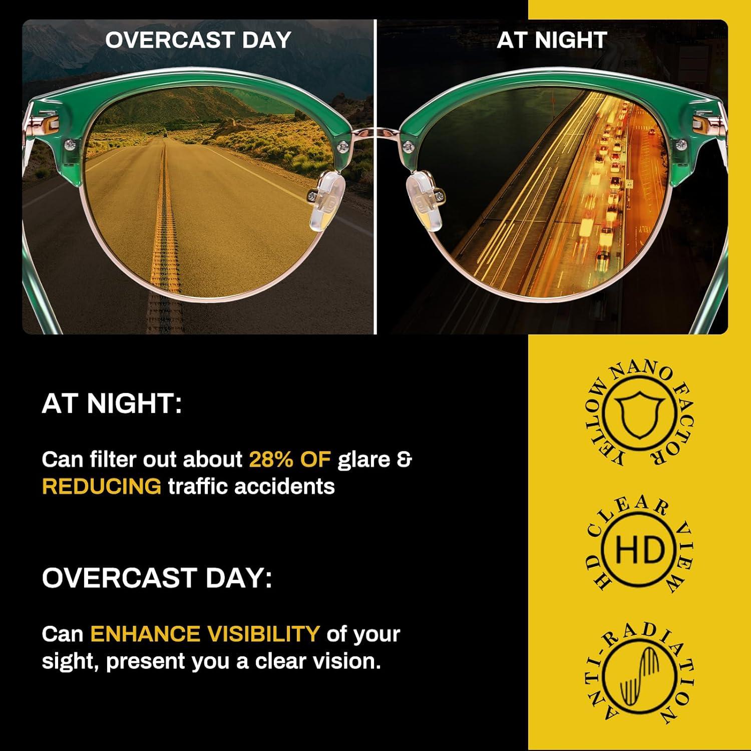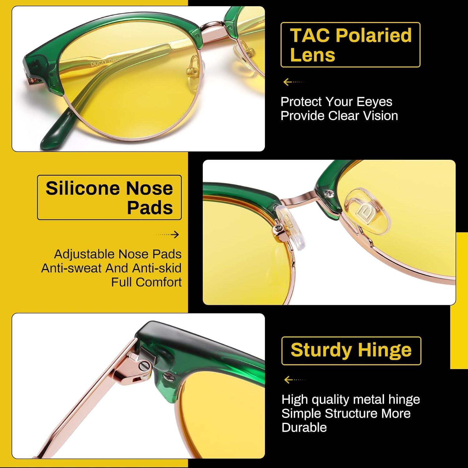 DUCO Round Semi-Rimless Night Vision Driving Glasses Polarized Anti Glare Eyewear for Men and Women HD Yellow Tinted(Transparent Green Frame Night Vision Lens)